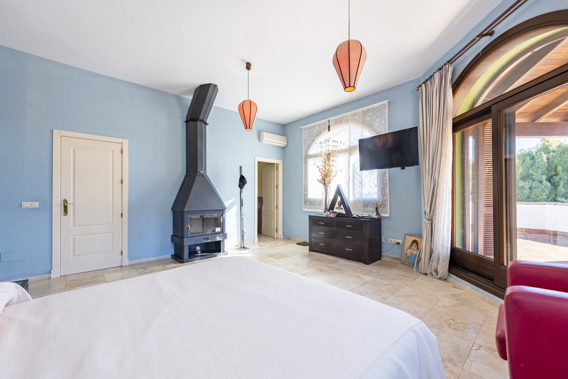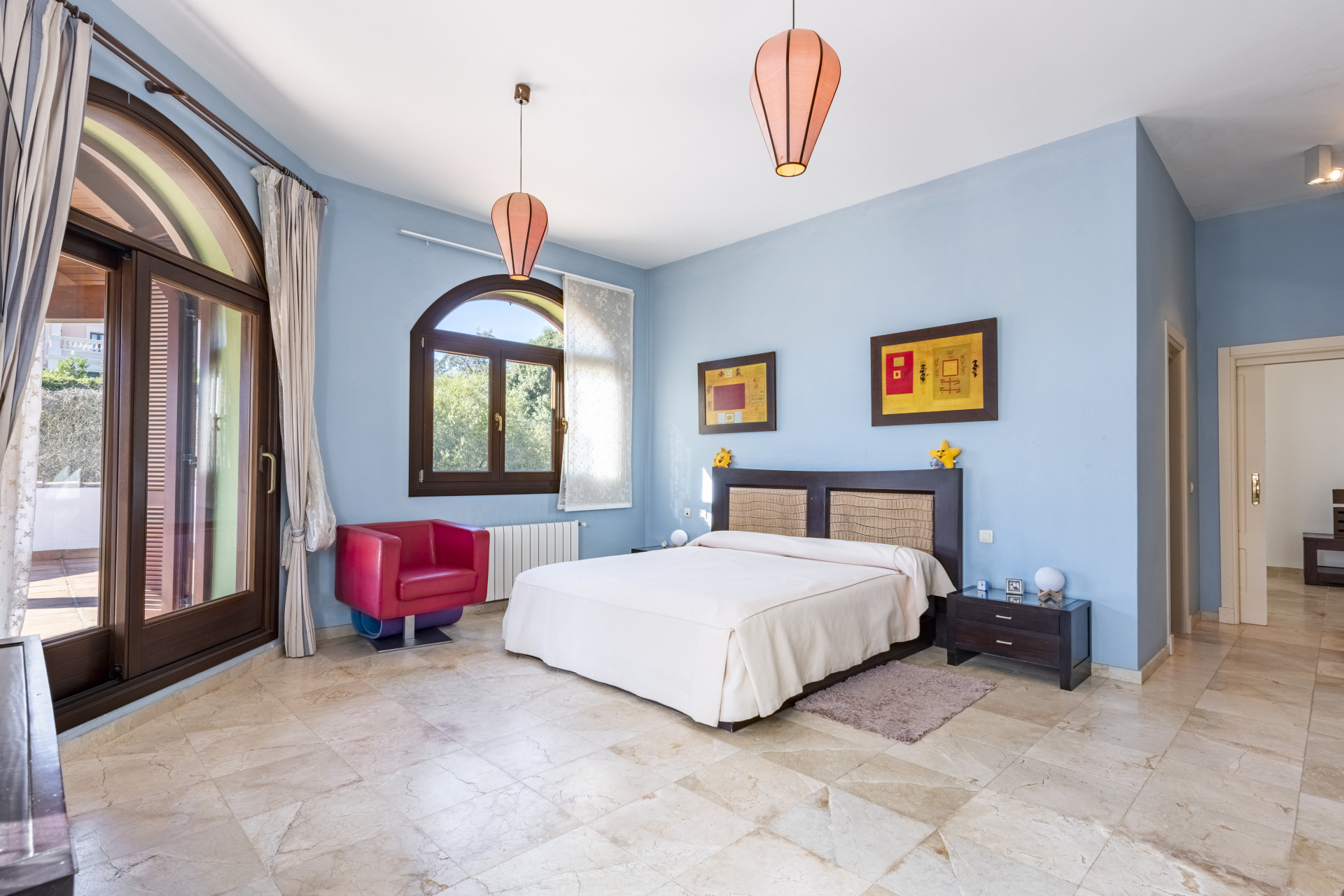 La villa cuenta con 5 amplios dormitorios y 5 baños, diseñados para ofrecer el máximo confort. El dormitorio principal, elegante y luminoso, dispone de un baño en suite y acceso directo a una espectacular terraza solárium con vistas abiertas al paisaje mediterráneo, creando un espacio perfecto para relajarse y disfrutar del entorno.
