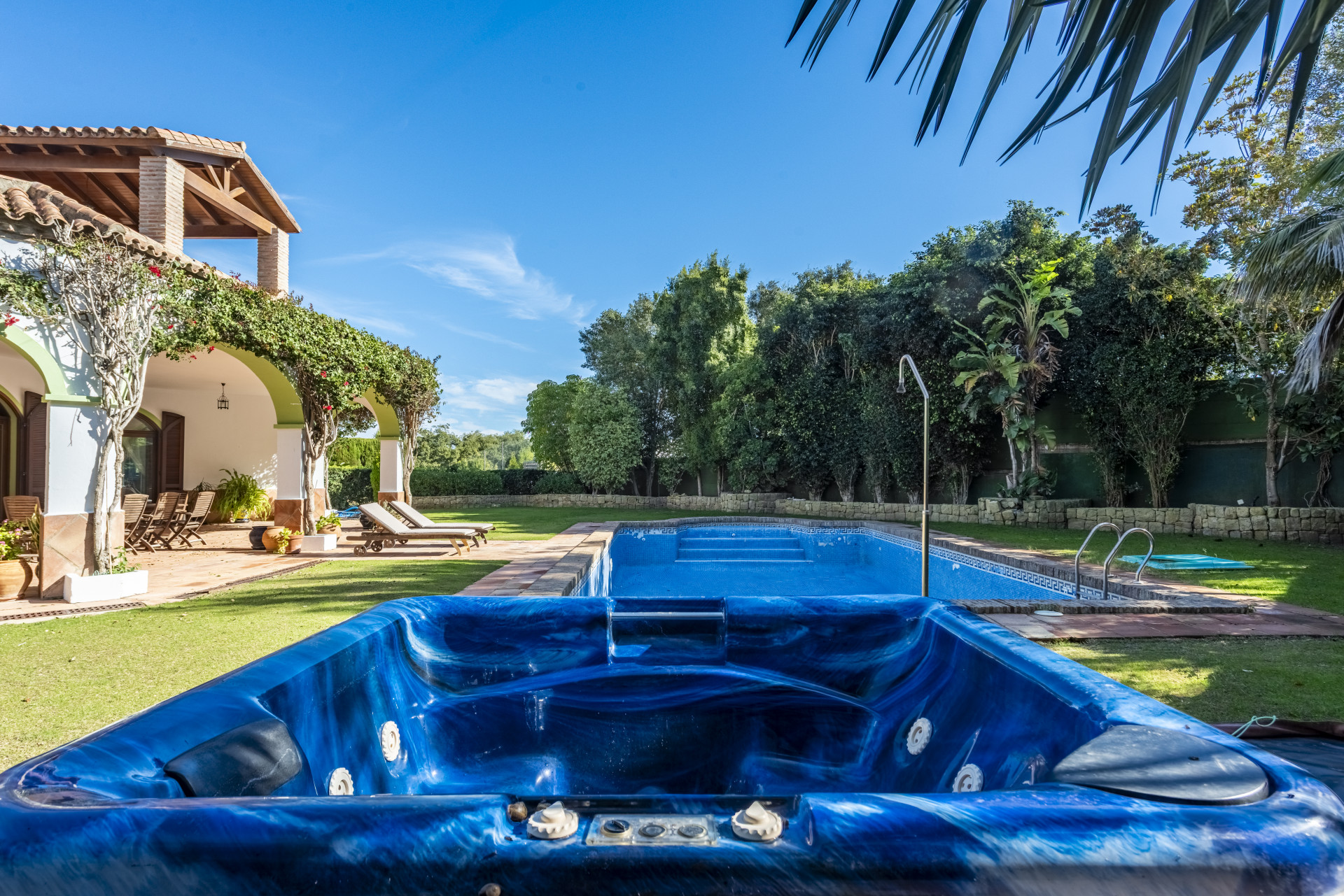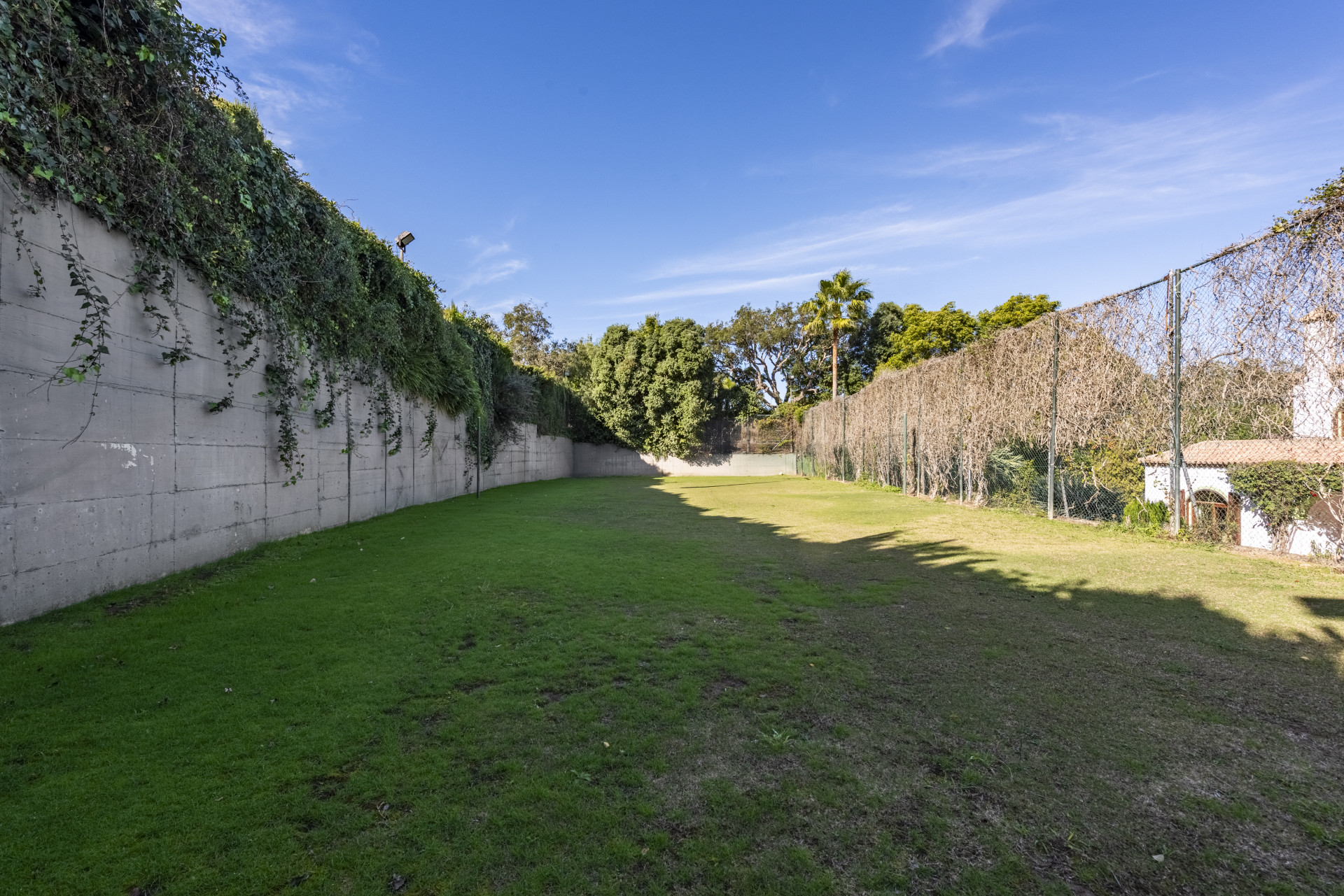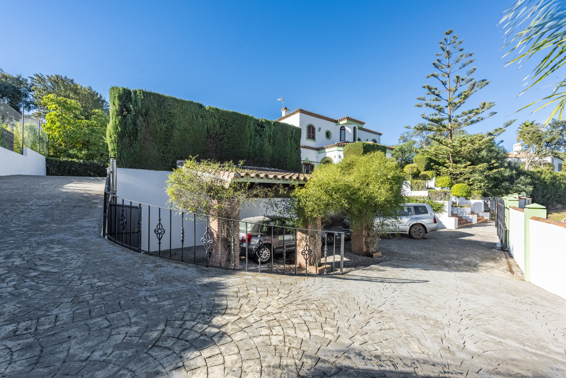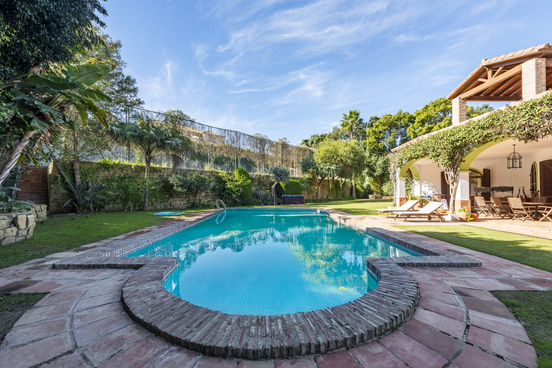 En el exterior, la propiedad destaca por su impresionante jardín maduro, cuidadosamente mantenido, donde se integra una gran piscina privada ideal para disfrutar del clima cálido de Sotogrande. Además, la villa dispone de una pista deportiva multifuncional, perfecta para jugar al tenis o al fútbol, un valor añadido excepcional para familias y amantes del deporte.